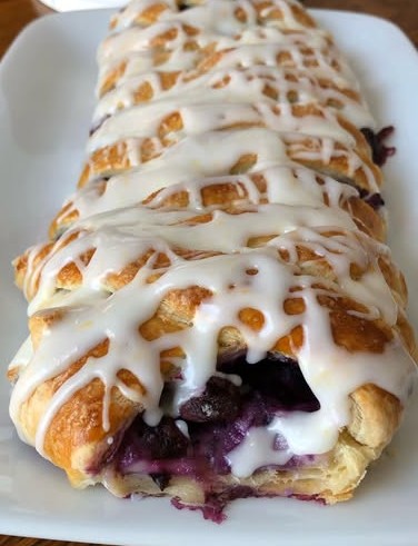 Starting at one end, fold the puff pastry strips over the filling, alternating sides and slightly overlapping one another, to cover the blueberries completely. Tuck the end strips under.