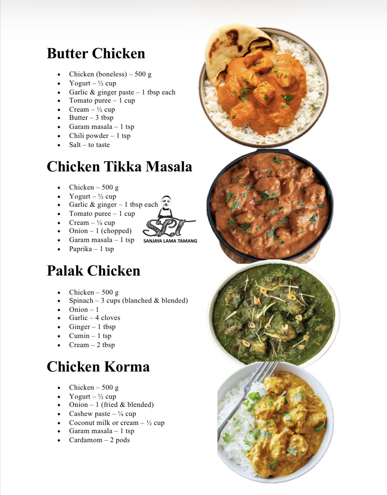 1. Marinate chicken with yogurt, garlic, ginger, and spices (2–4 hrs).