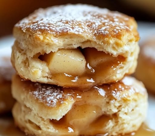 Spoon a small amount of apple pie filling onto the center of each biscuit. Fold the biscuit over the filling and pinch the edges to seal.