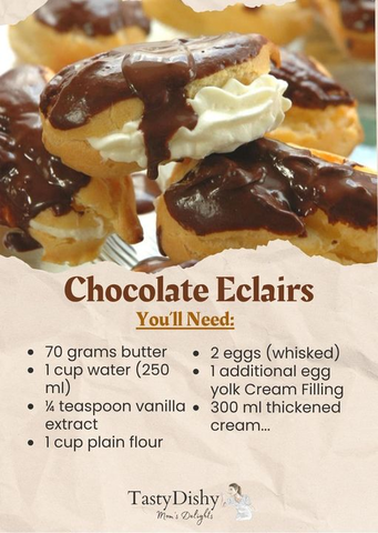 8. Cut eclairs in half horizontally with a bread knife, leaving one long edge intact. Return to the oven for 3 minutes, then let them cool on a rack.