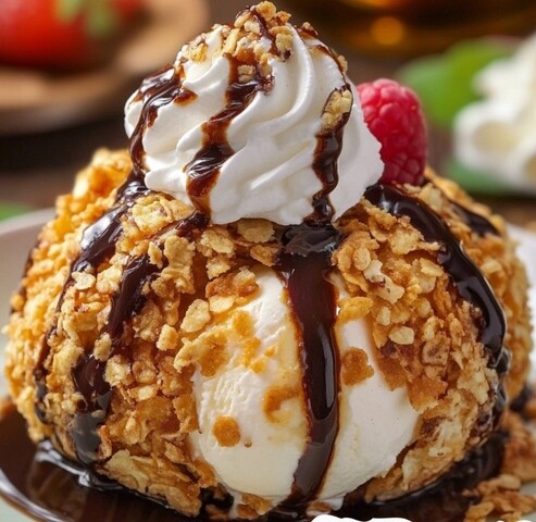 Fry each coated ice cream ball for 10-15 seconds until golden brown. Remove with a slotted spoon and drain on a paper towel.