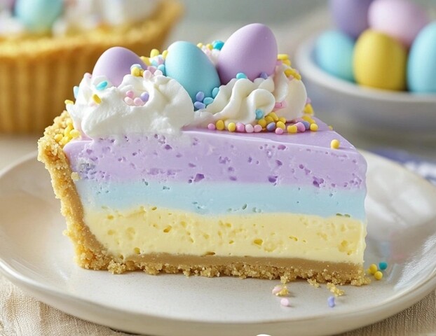 Decorate: Before serving, top with whipped cream, pastel sprinkles, and candy eggs for a festive Easter touch. Slice and enjoy!