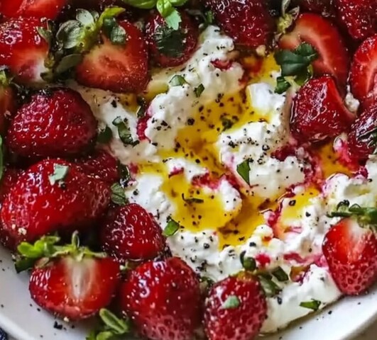 Spread the whipped feta on a serving plate and top with roasted strawberries.