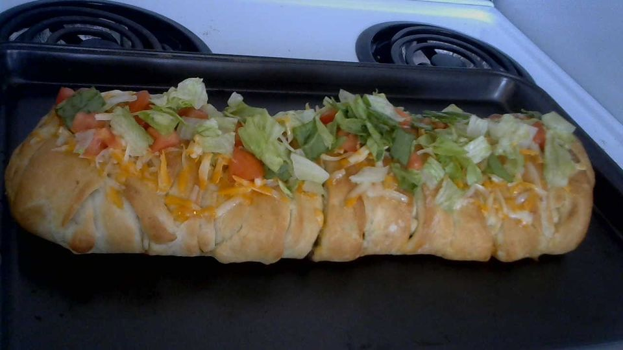 You need dough ( i make my own) to roll out to 10x15 on parchment paper, Cut dough on both sides in strips about 1 inch wide and cut in toward center about 3 inches . Put ground beef mixture in the center. Top with grated cheddar cheese and diced tomatoes. overlap the dough strips from both sides to form a braid. Brush over with melted butter . Place the parchment paper on a cookie sheet . Bake at 375 for 25 minutes. When baked, top with more cheese, diced tomatoes and shredded lettuce. Serve with sour cream and taco sauce.