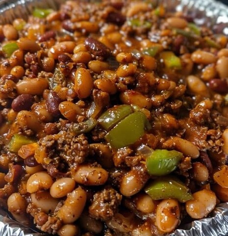 Combine everything – In a 9×13 baking dish (or Dutch oven), mix the baked beans with the cooked beef, bacon, sautéed veggies, and sauce. Stir well.
