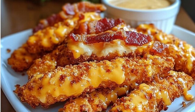 Arrange and Top: Place the coated chicken tenders on the prepared baking sheet. Sprinkle crumbled bacon on top of each tender.