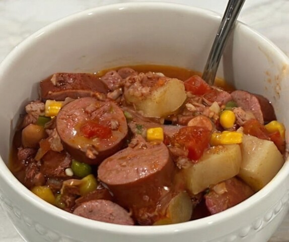 Sauté onion and beef together until cooked. Drain. Add sliced sausage until cooked.