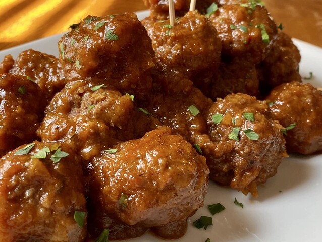 Notes: You can easily double or triple this recipe for a larger crowd using a 6- or 8-quart slow cooker. You can also bake these meat balls in the oven in a 2-quart casserole dish covered with foil for 45 minutes at 375F. Uncover and bake an additional 8 minutes.