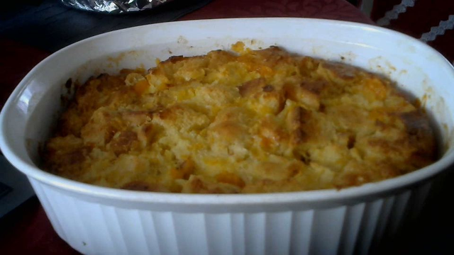 cream together 1/2 c margarine and 1 c sugar....add 4 eggs, one at a time. Add i tin crushed pineapple(drained) ,2 tins mandarin oranges (drained)and 6 slices cubed bread. Stir until all is coated. Put it in a greased dish and bake at 350 for 1 hour and let it rest in dish for 30 minutes to set before serving