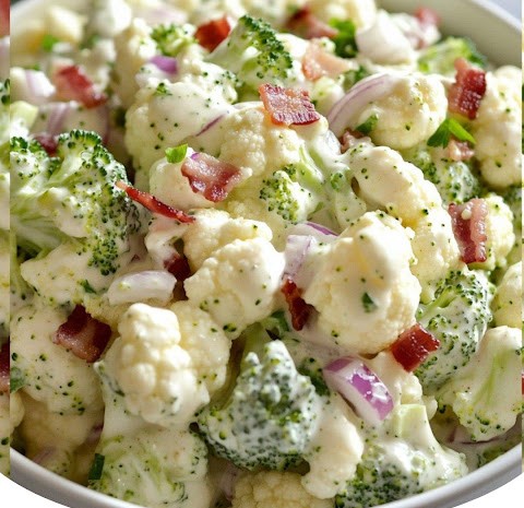 In a large mixing bowl, combine the broccoli, cauliflower, red onion, cheddar cheese, and crumbled bacon.