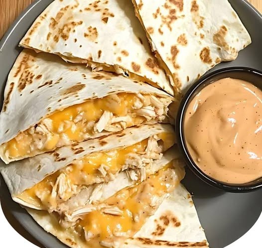 Spread a layer of sauce on one side of each tortilla. Add shredded chicken and cheese. Fold the tortilla in half.