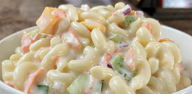 In a large bowl, combine the macaroni and vegetables. Add the cheese cubes. In another bowl, combine with a whisk the mayonnaise, sweetened condensed milk, vinegar, sugar, salt & pepper. Pour over the salad and thoroughly combine. Store in the fridge until time to serve. Store leftovers in the fridge. Serves 15-20